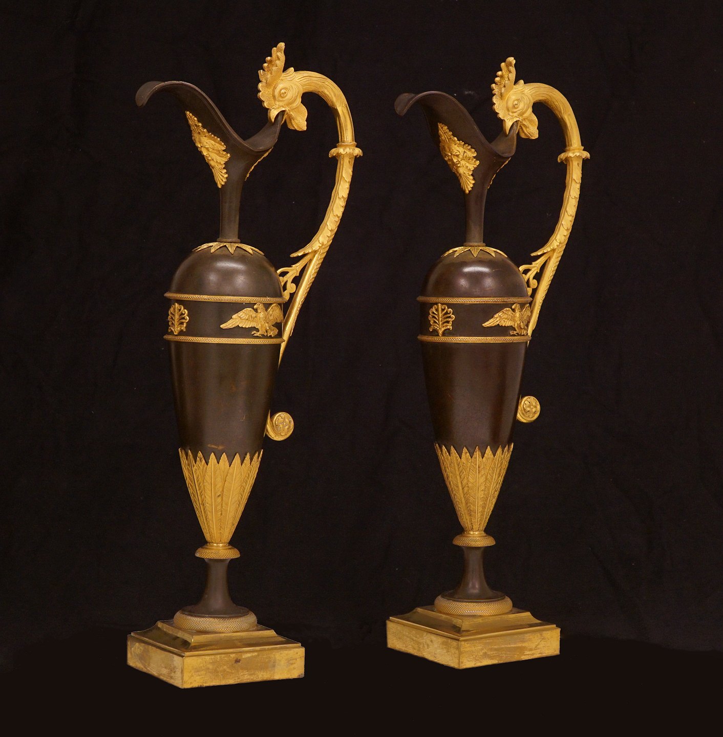 Et par lueforgyldte bronze prydkander med hanehoveder. Rusland ca. år 1810. H: 45cm