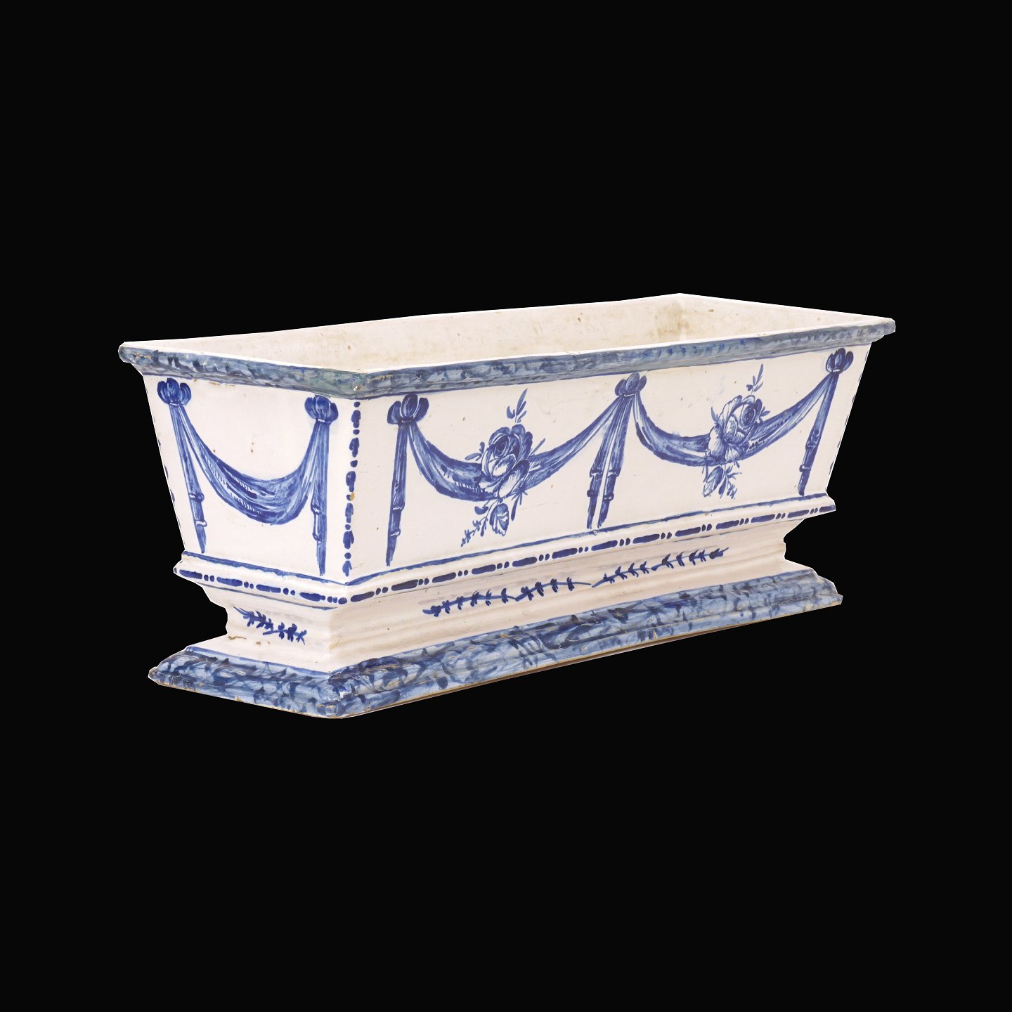 Aflang blomsterkumme, blådekoreret, fajance. Slesvig ca. år 1760. H: 15,5cm. L: 39cm. B: 14,5cm