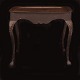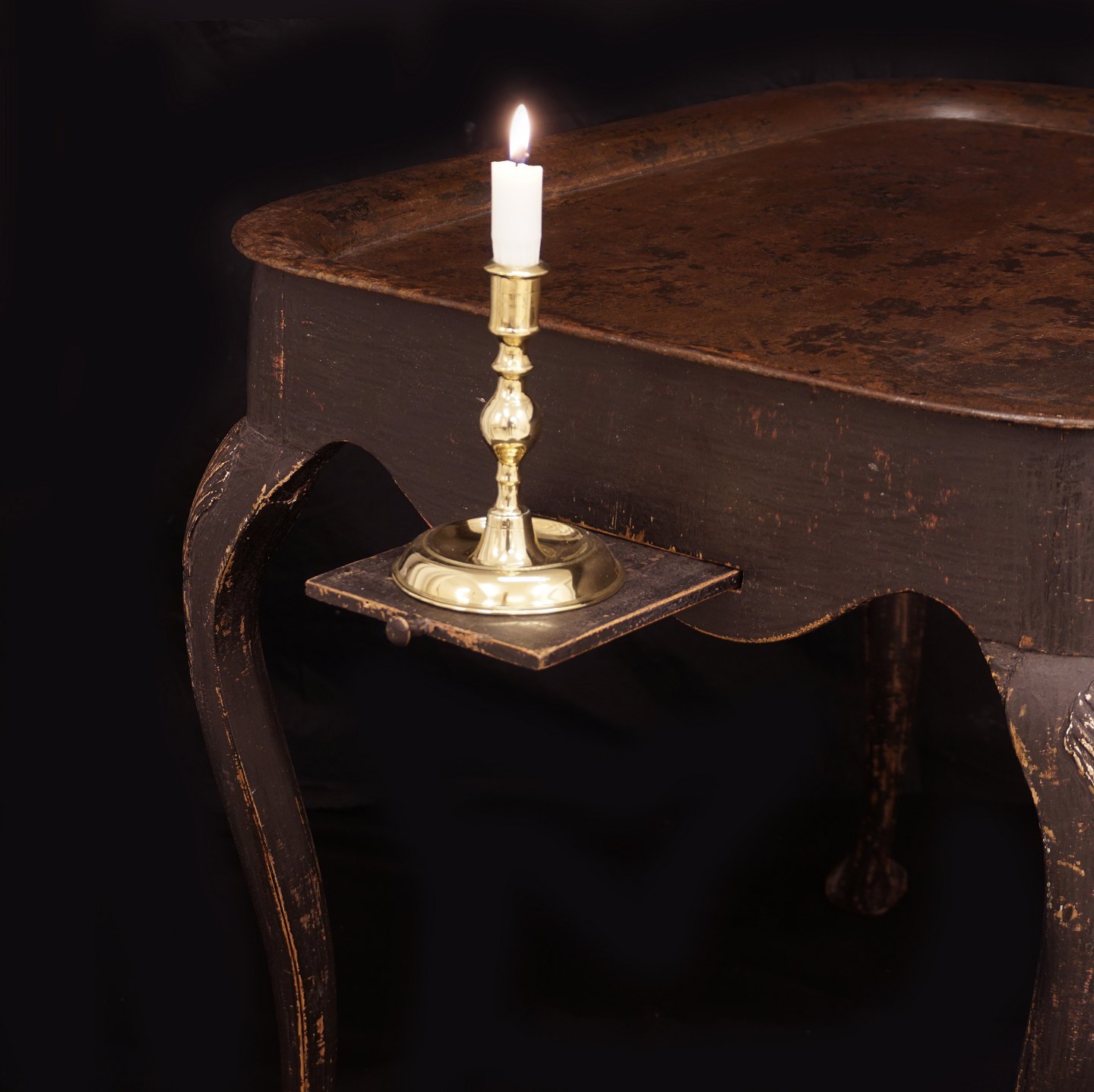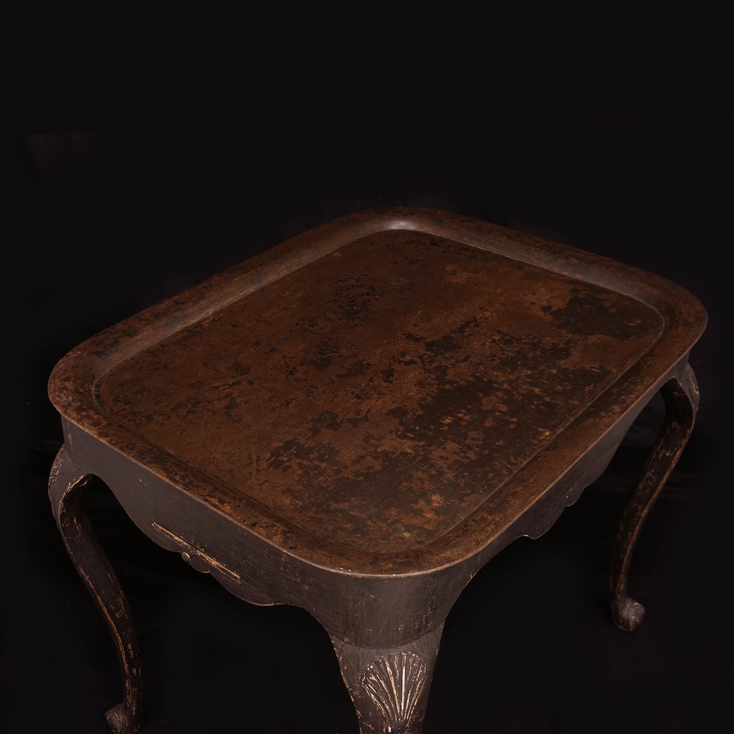 Sortdekoreret rokoko bord med metalplade og rester af forgyldning. Plade i form af metalbakke. Begge sider med udtræk til lysestager