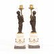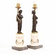 Et par lueforgyldte bronzestager med sortpatinerede figurer bærende stagen. Sokkel af marmor