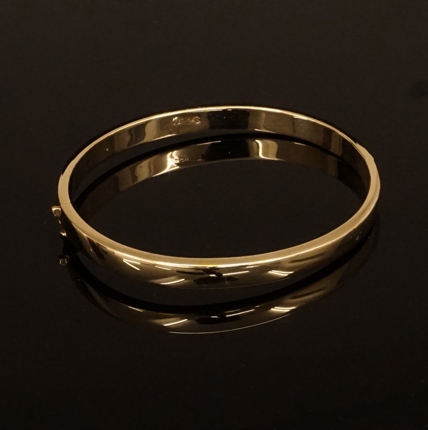 Skrivers Guldvarefabrik, Randers: Oval armring i 14kt guld. Kasselås med sikkerhedslås. Indv. mål: 5,3x6,0cm
