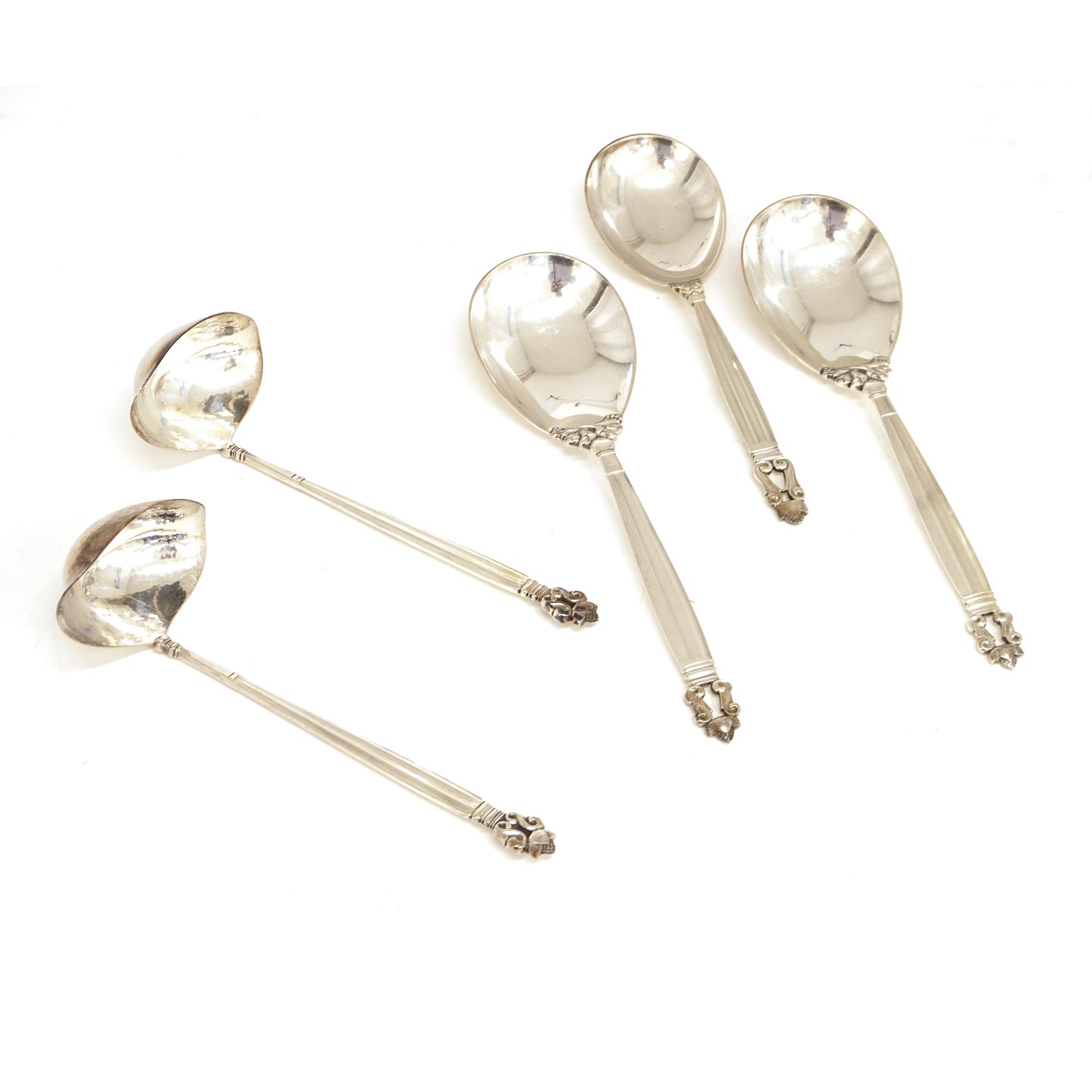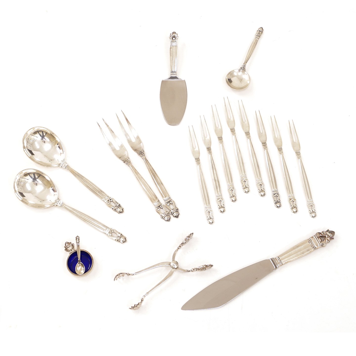Stort Georg Jensen Kongebestik i sterlingsølv til 12 personer bestående af middags- og frokostbestik samt mange forskellige serveringsdele. 126 dele i alt
