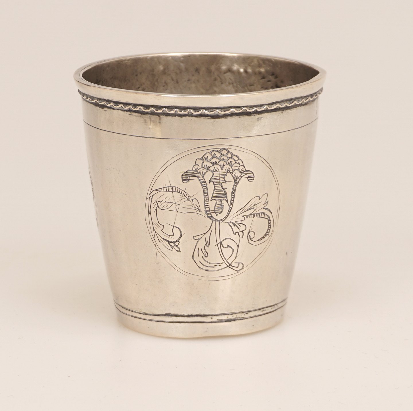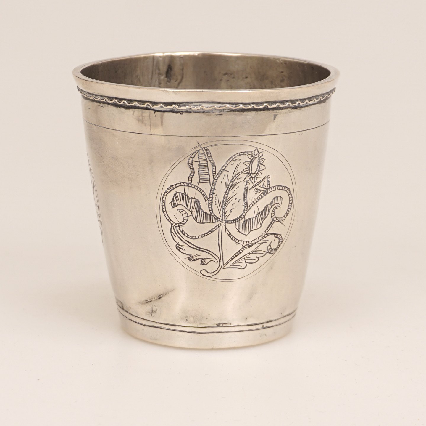 Søren Christensen, Varde, 1820-43: Lille Sølvbæger prydet med tre kartoucher, hvori stiliserede blomster og navnetræk i laurbærkrans. Dateret 1826