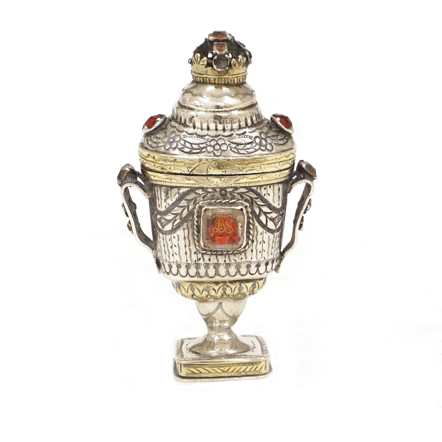 Hovedvandsæg i delvist forgyldt sølv prydet med flusser. Med navnetræk "BS" og årstal 1842. Poul Hansen, Tønder, 1785-1830. H: 8,9cm
