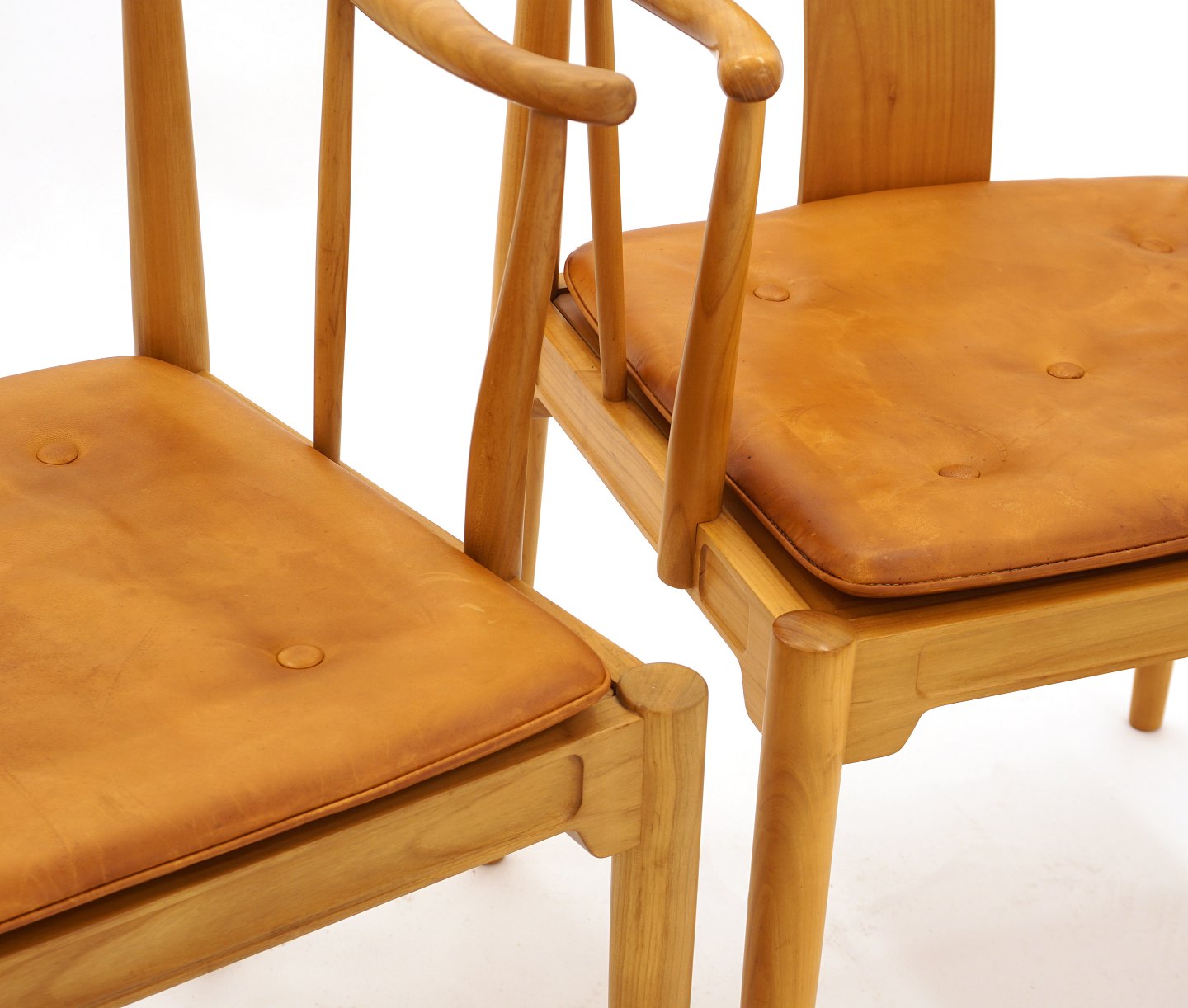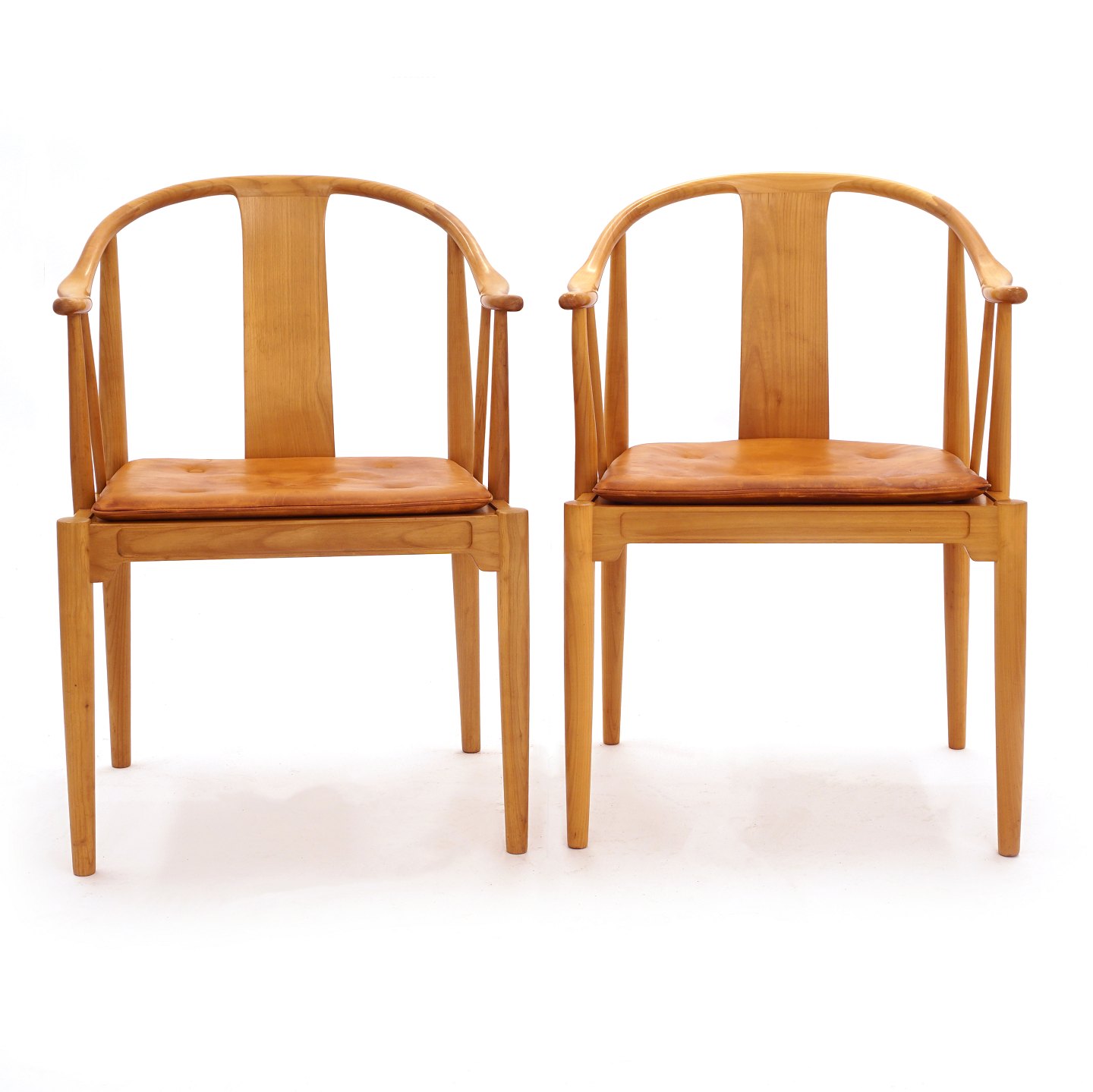 Hans J. Wegner: Et par meget flot patinerede Kinastole i kirsebær. En med etiket fra Fritz Hansen. Hynder i cognacfarvet læder.