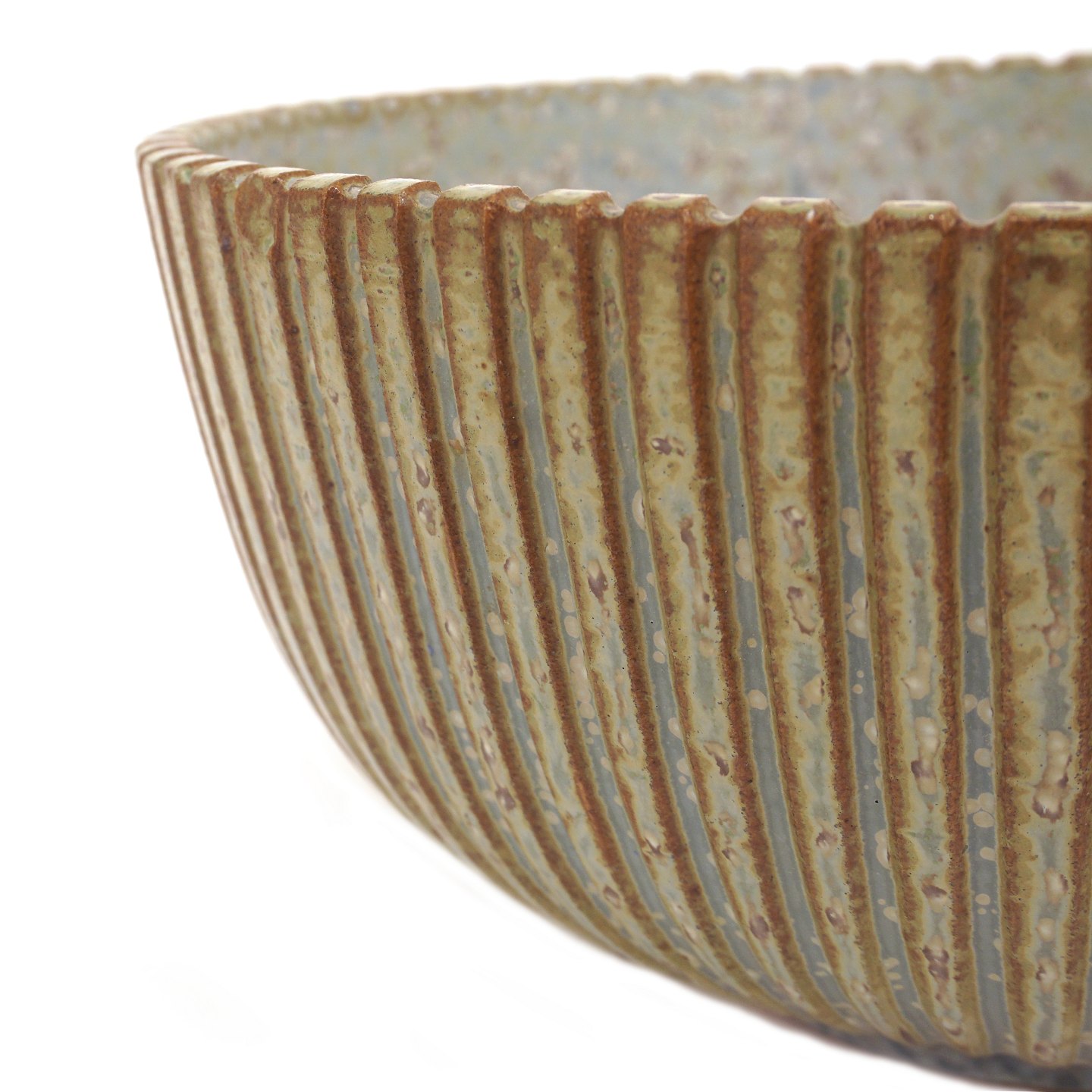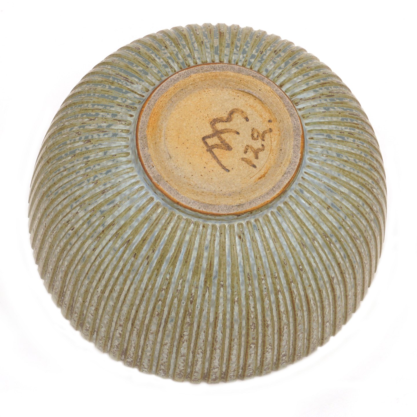 Arne Bang skål i stentøj med grønblå spættet glasur og riflet korpus