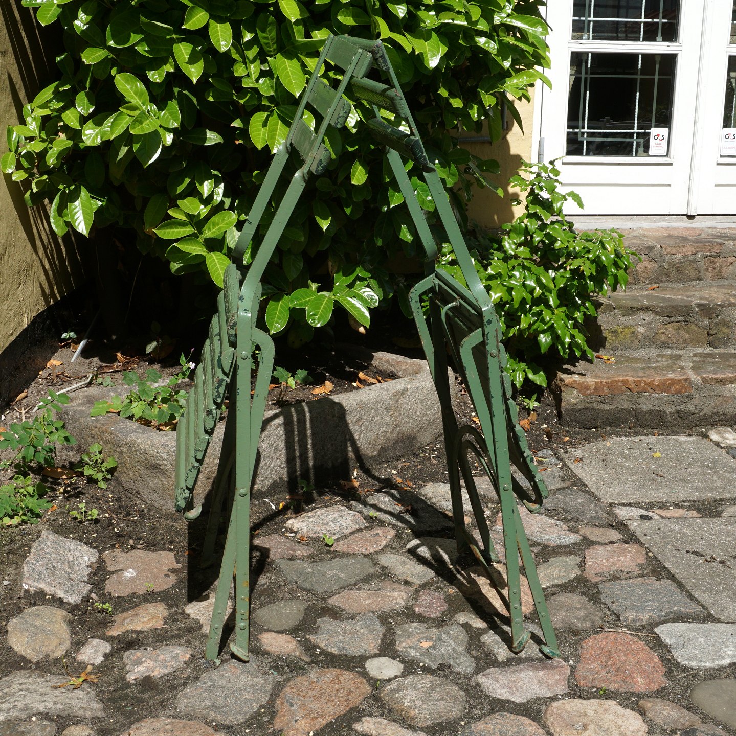 Havestole med jernstel og sæde og ryg af træ hidrørende fra Antwerpen Zoo