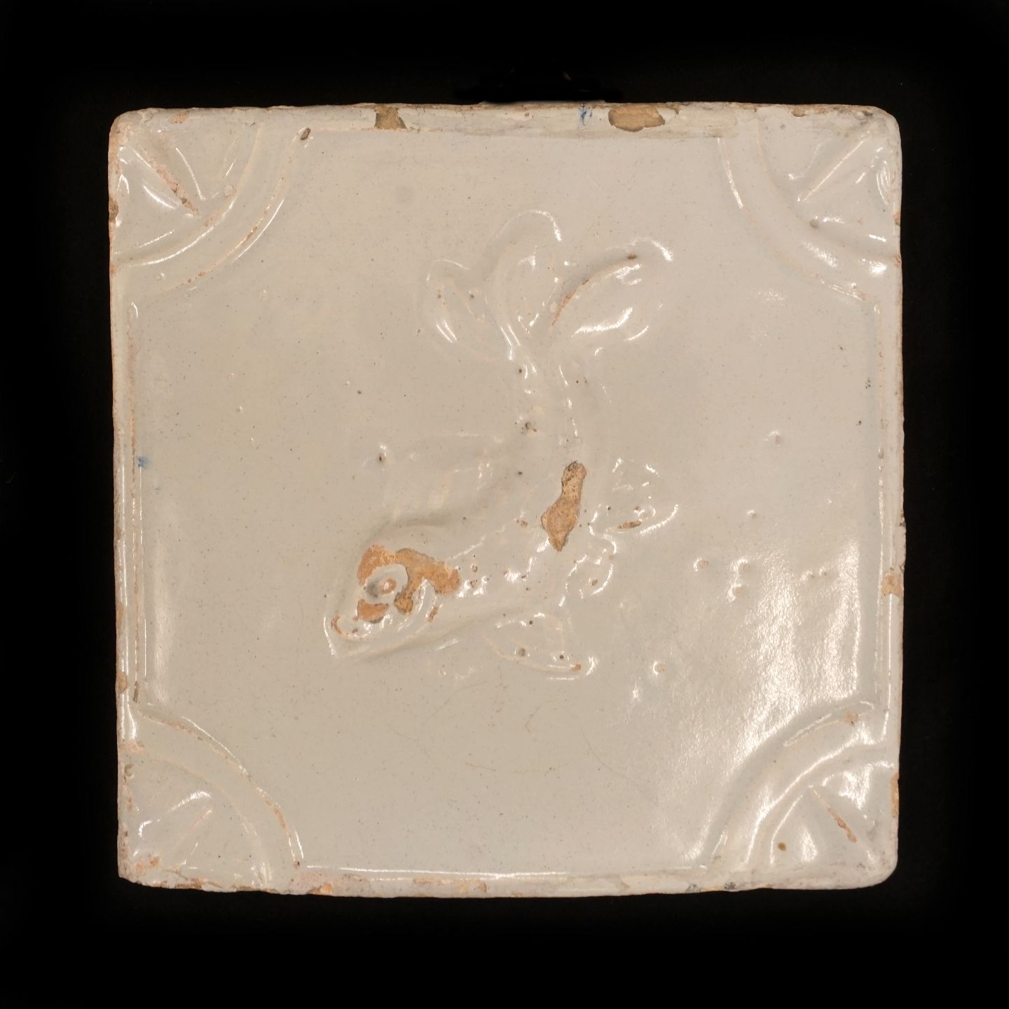 Lyst glaseret reliefflise med motiv i form af fisk. Fremstillet på Blåtårn Fabrikken, København, ca. år 1740. Mål: 13x13cm