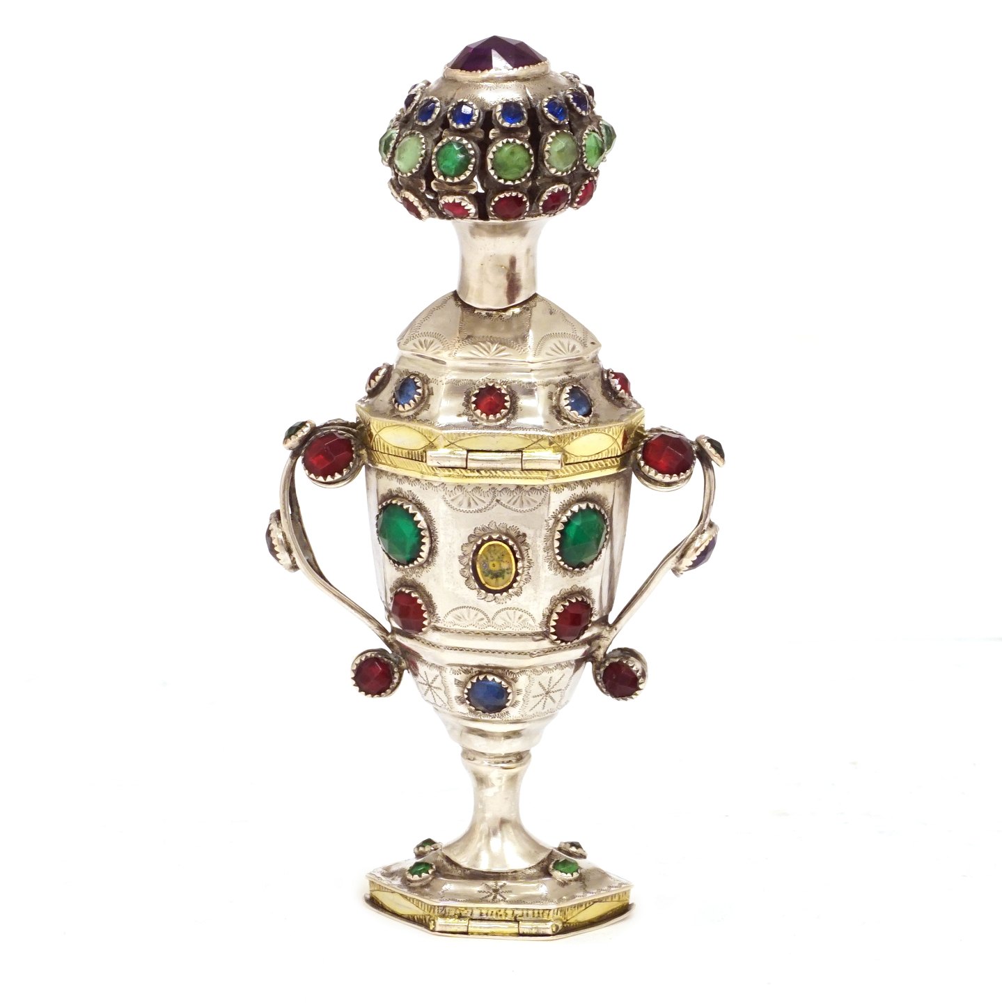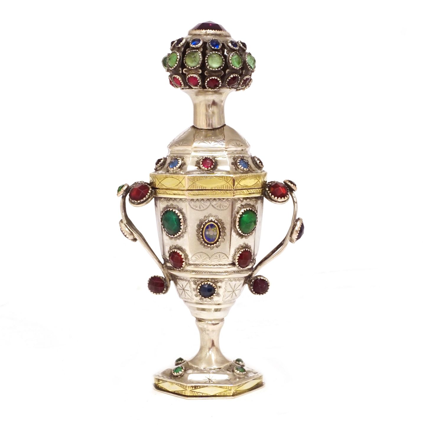 Hovedvandsæg i delvist forgyldt sølv prydet med 67 flusser. Mester Jens Jensen, Sønderborg, ca. år 1867. H: 13cm. V: 87,4gr