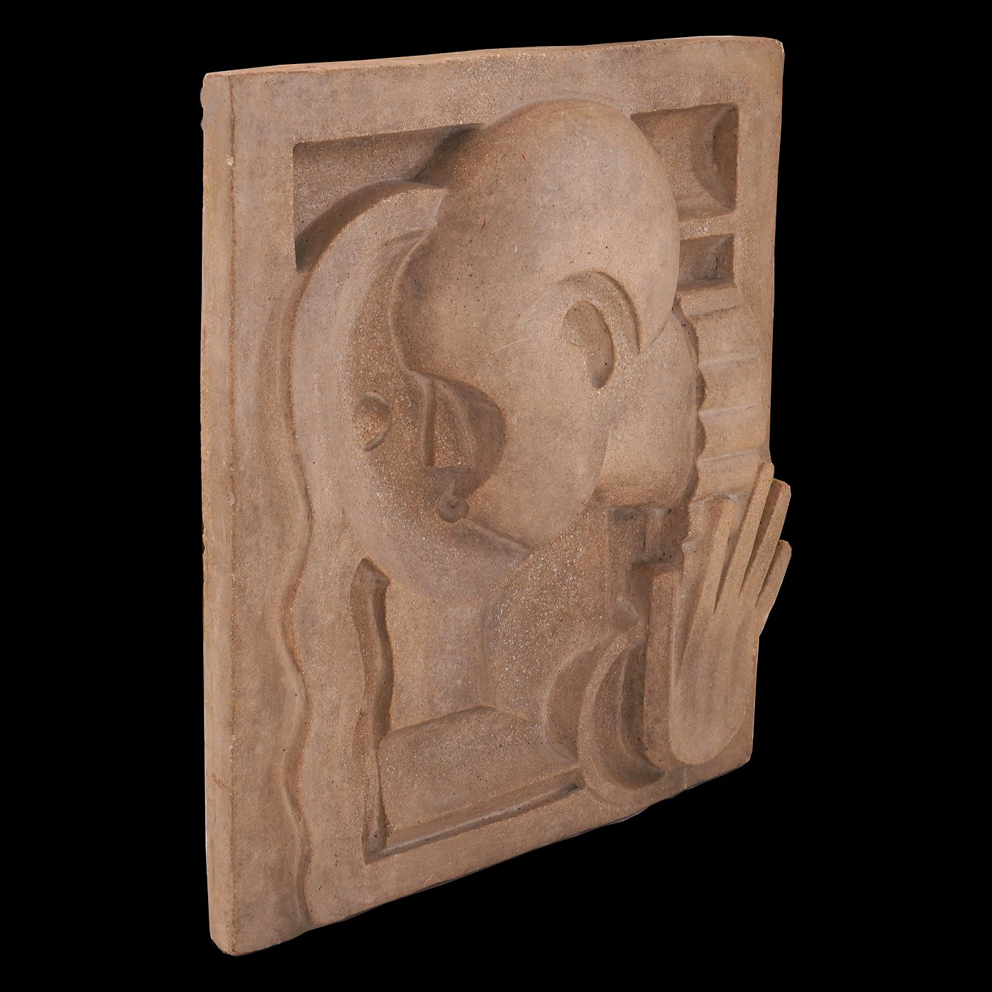 Relief udført i kunststen i dyb relief med motiv i form af mand & kvinde