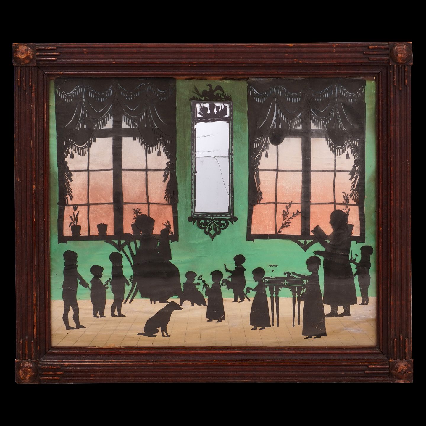 Stor silhuet udført i Johann Adolf Bendix Rothermundts stil visende familie i dagligstue. Pæn stand dog med små skader. Spejl med revne. Ca. år 1800. Lysmål: 45x52cm. Med ramme: 55x62cm