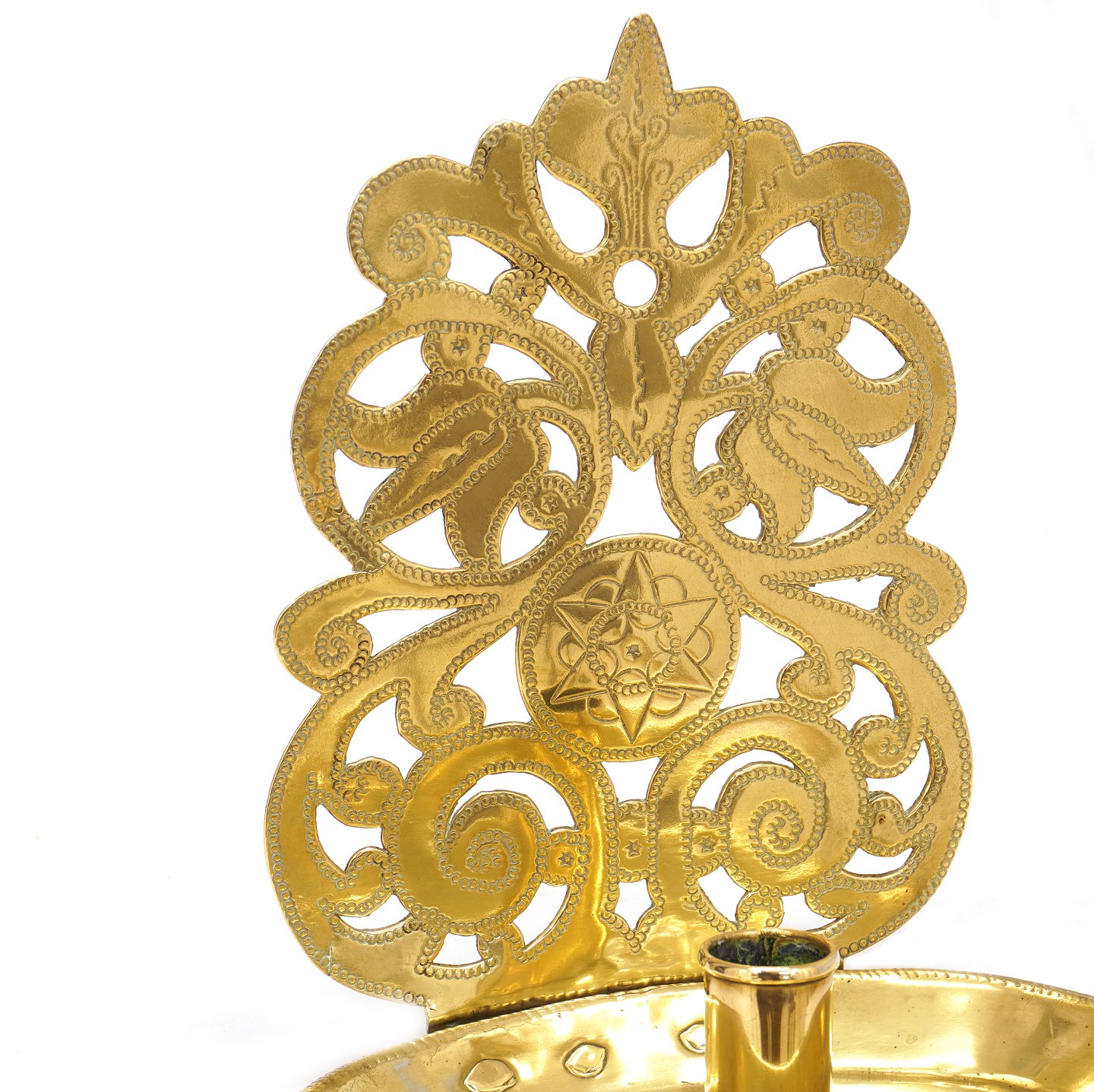 Væglampet udført i messing med gennembrudt cisileret dekoration i form af stilisterede blomster