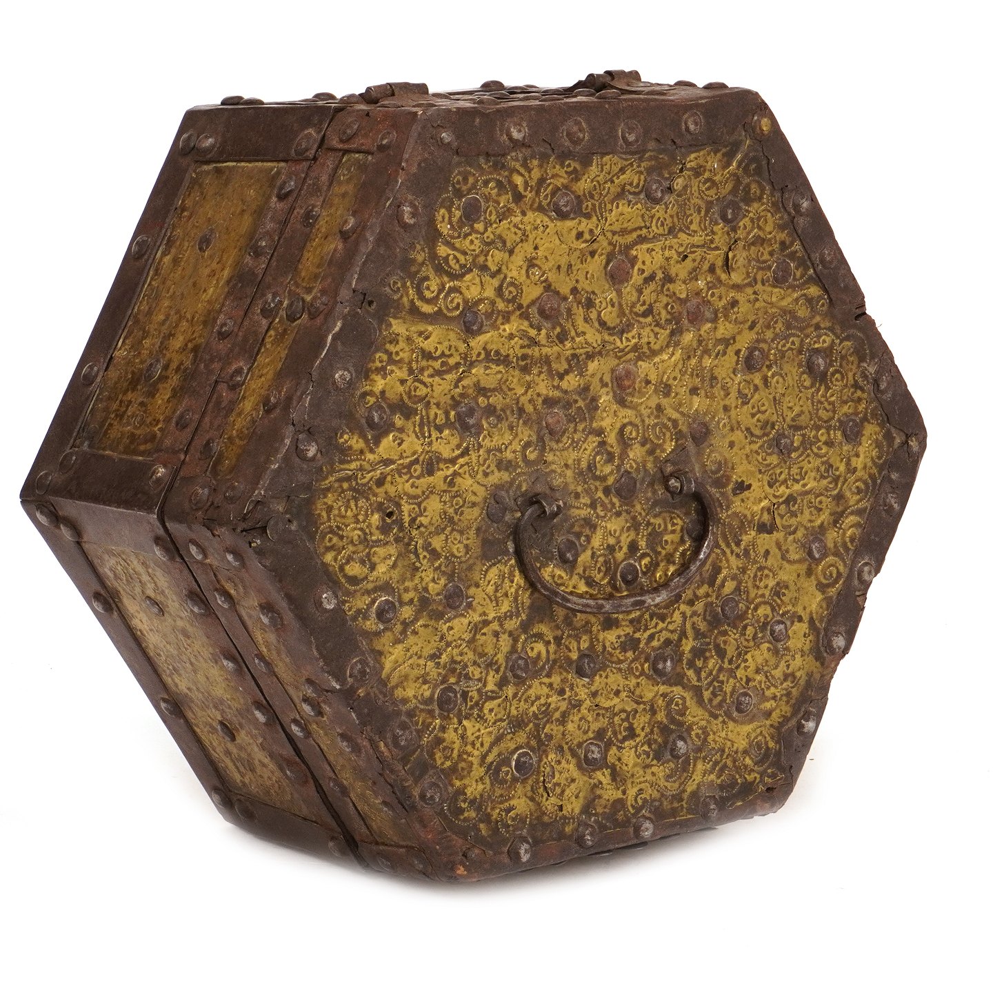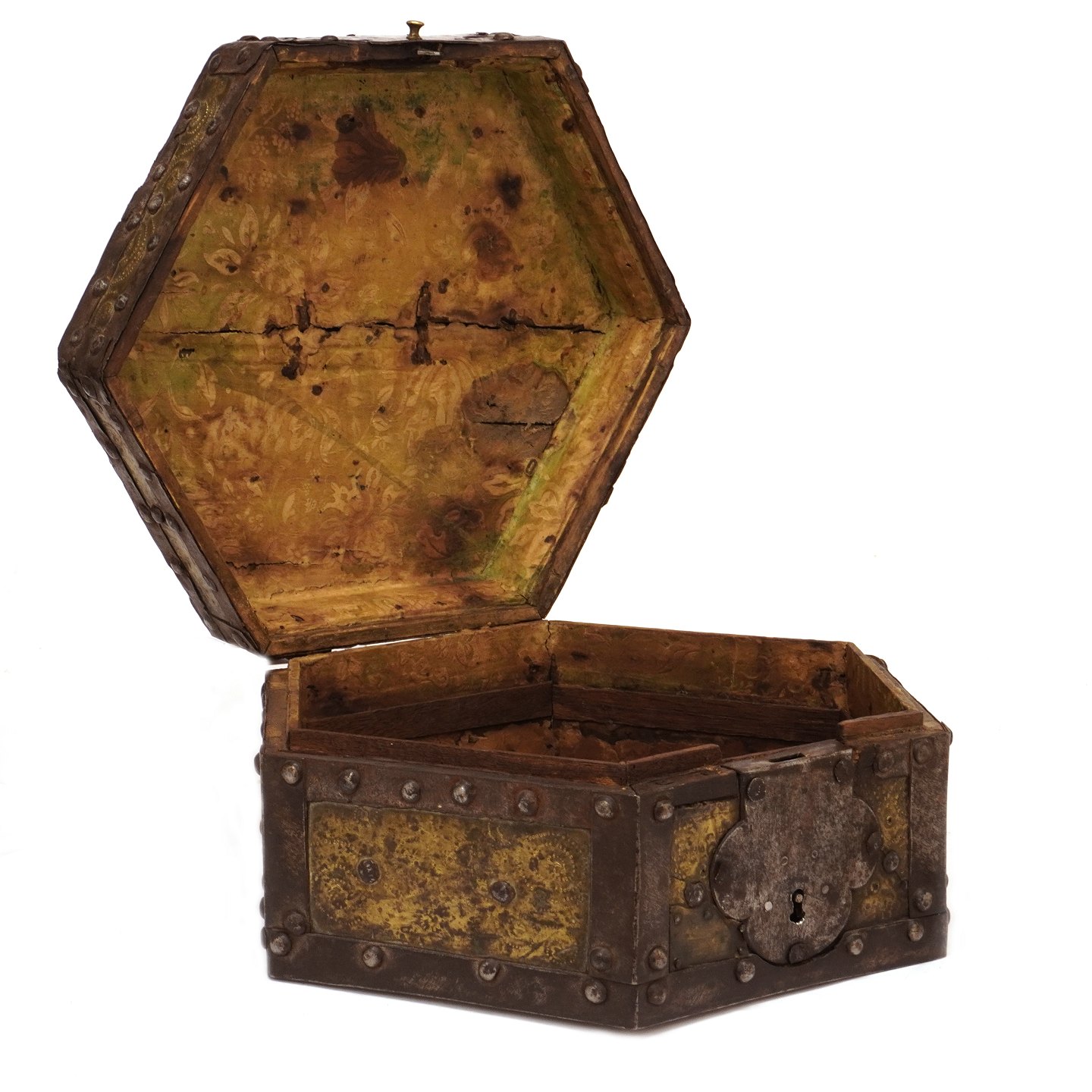 Ottekantet Barok brudeskrin med jernbeslag, Sverige ca. år 1680-1700. H: 15cm. D: 28cm
