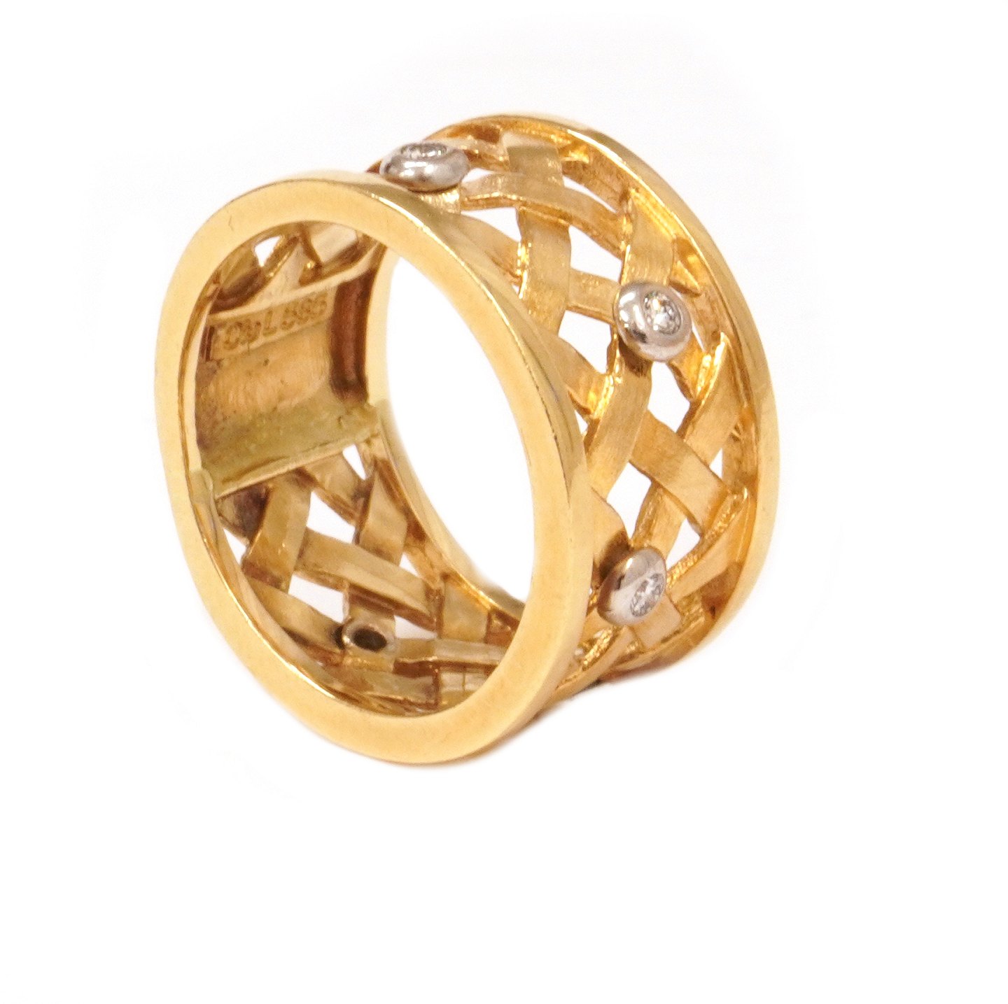 Ole Lynggaard fletring i 14kt guld prydet med 5 brillanter. Stemplet Ole L. Ringbredde: 11mm. Ringstr: 54