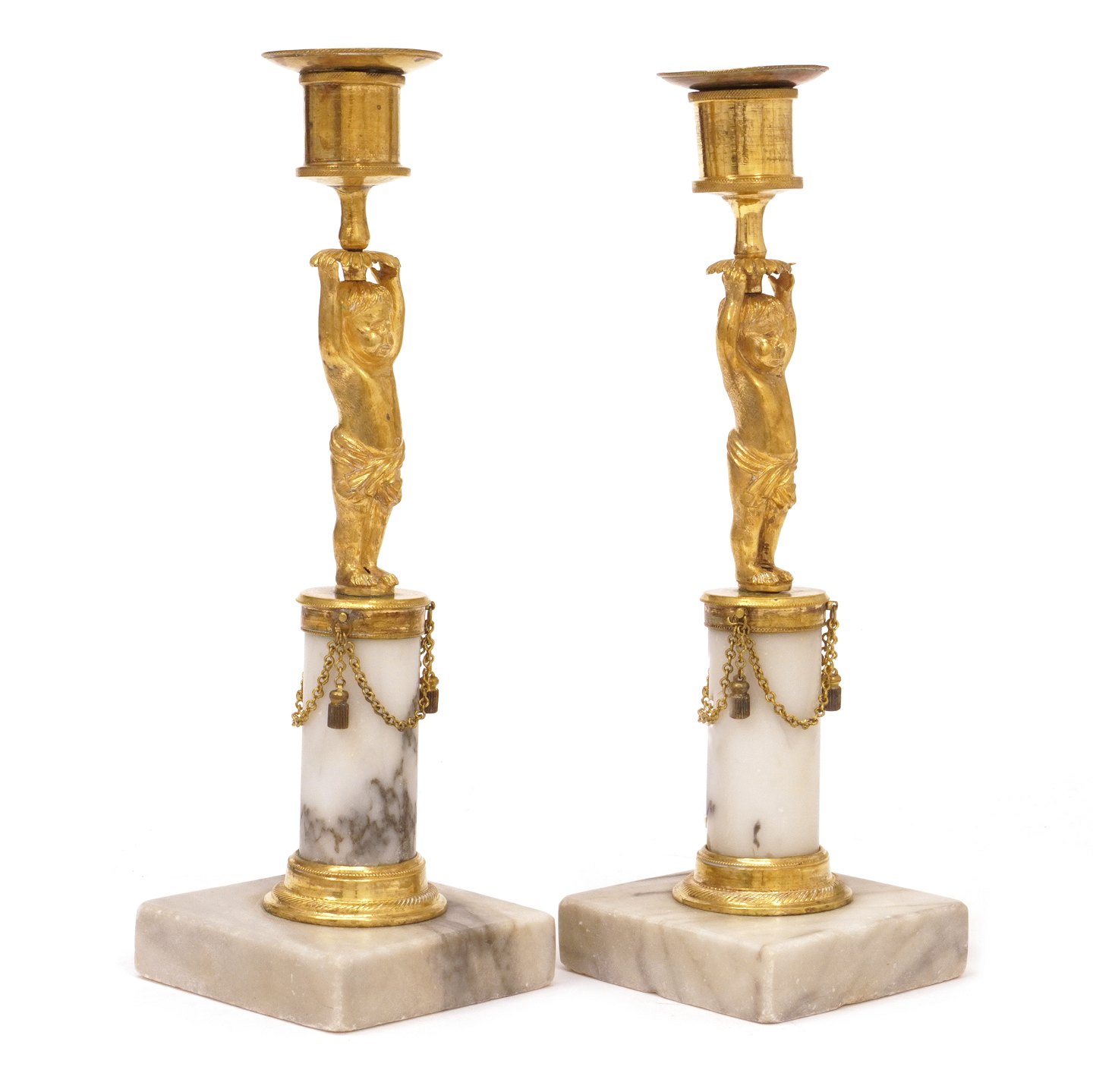 Et par lueforgyldte bronzestager i form af putti på marmorsokler
