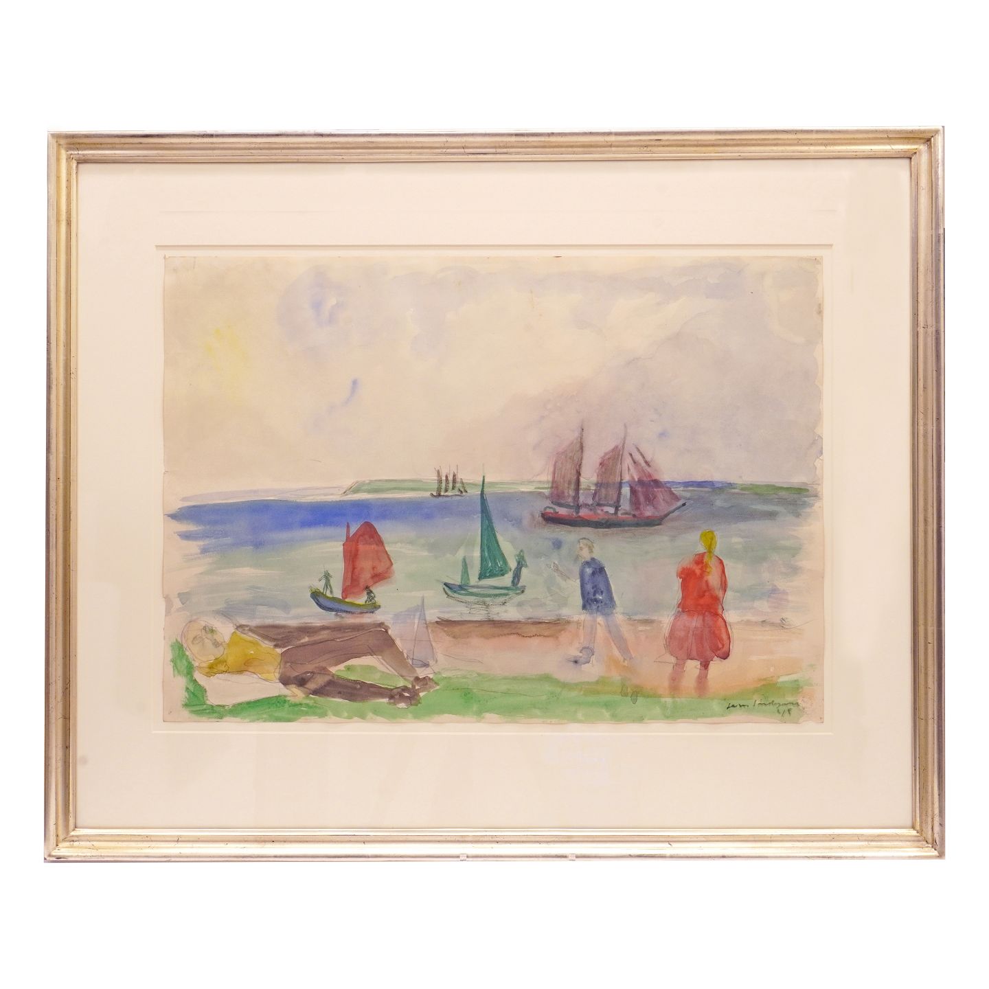 Jens Søndergaard akvarel. Jens Søndergaard, 1895-1957, akvarel med motiv i form af fjordlandskab med mennesker og skibe. Signeret og dateret 1945. Lysmål: 44x62cm. Med ramme: 68x84cm
