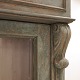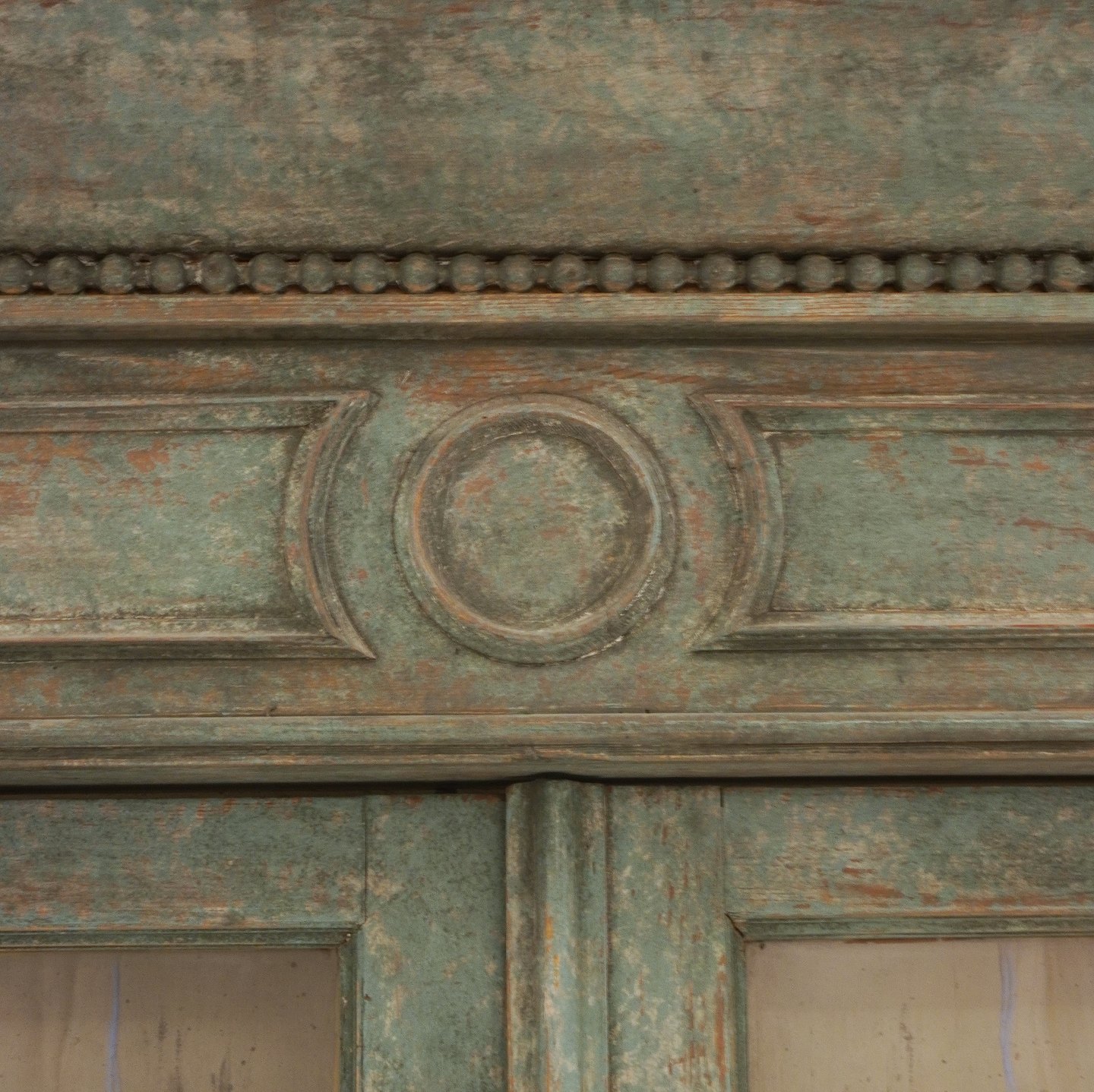 Light grey/green decorated display cabinet around 1850. H: 213cm. W: 139cm. D: 36cm (top) / 25cm