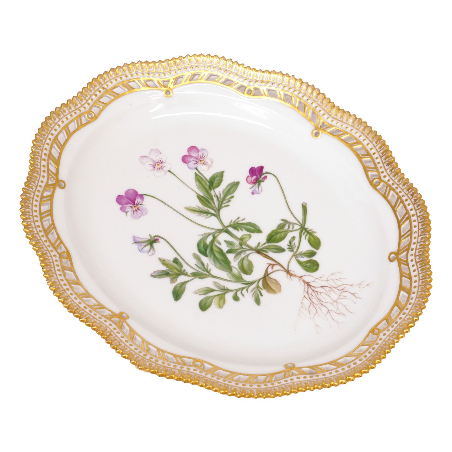 Flora Danica ovalt serveringsfad med gennembrudt fane. "Viola tricolor". Royal Copenhagen år 1950. Mål: 27x22cm