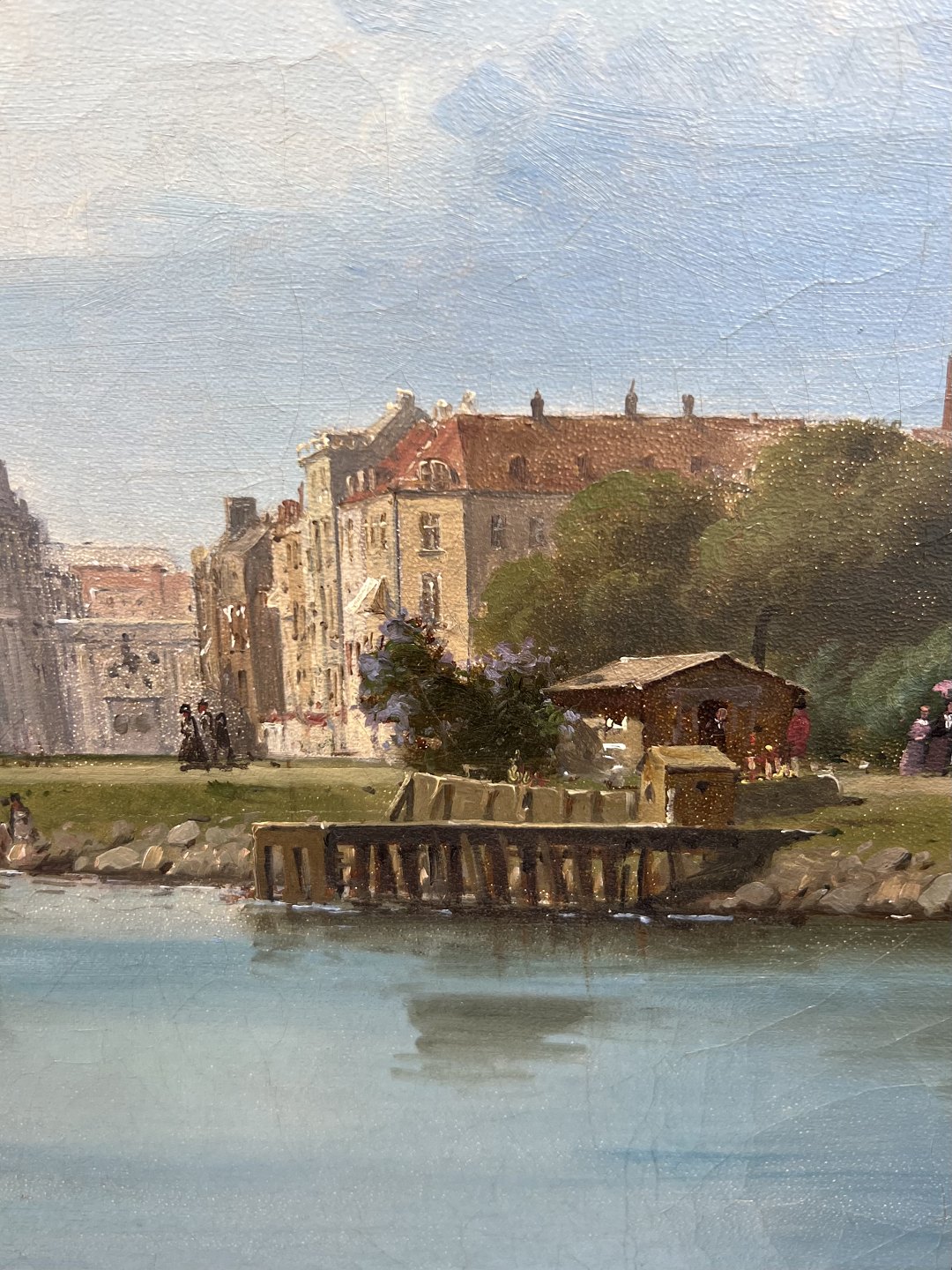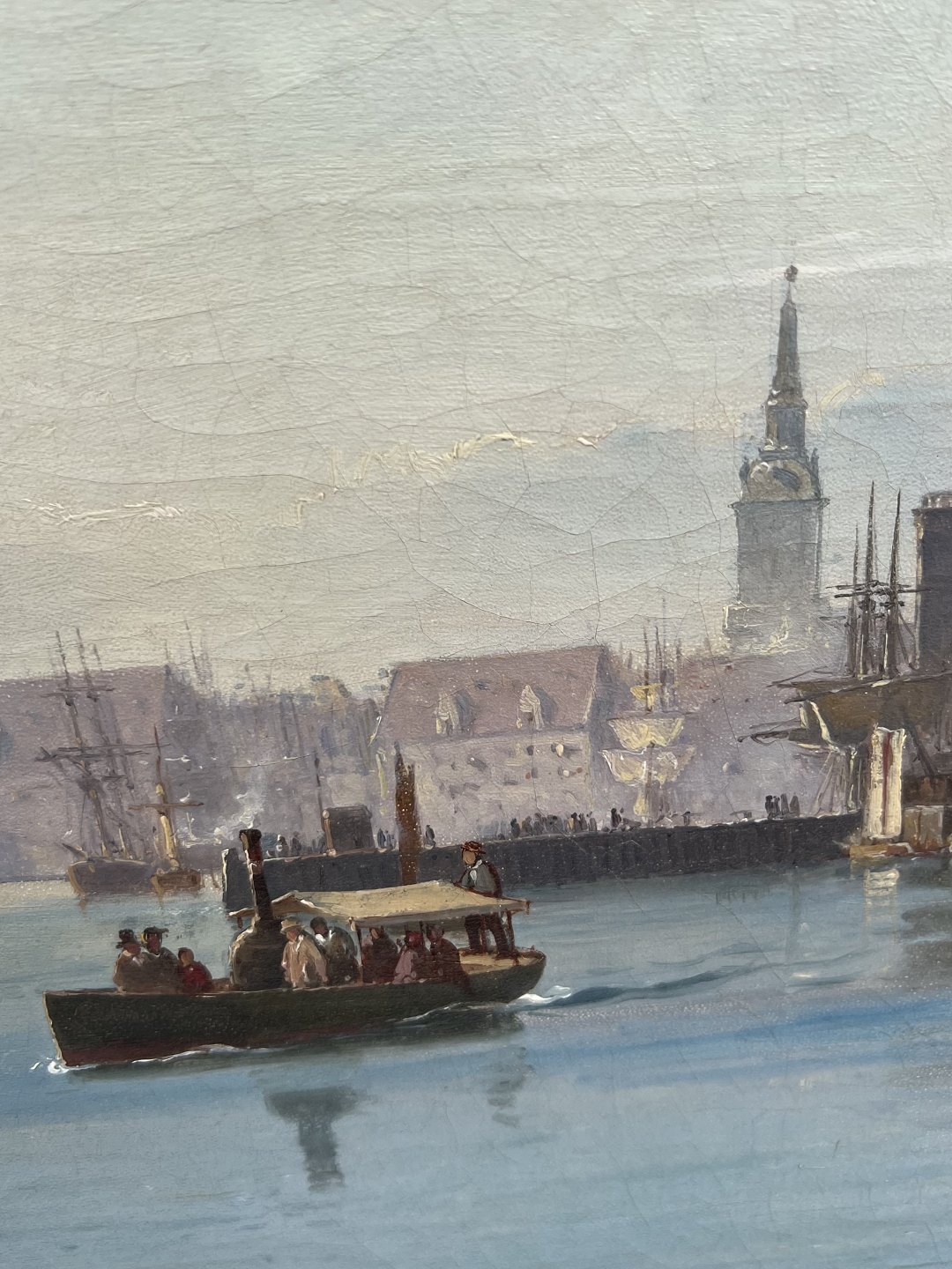 C. F. Sørensen Maleri. Carl Frederik Sørensen, 1818-79, olie på lærred. Toldboden og indsejlingen til Københavns Havn. Signeret og dateret 1863. God stand. Lysmål: 78x123cm. Med ramme: 95x140cm