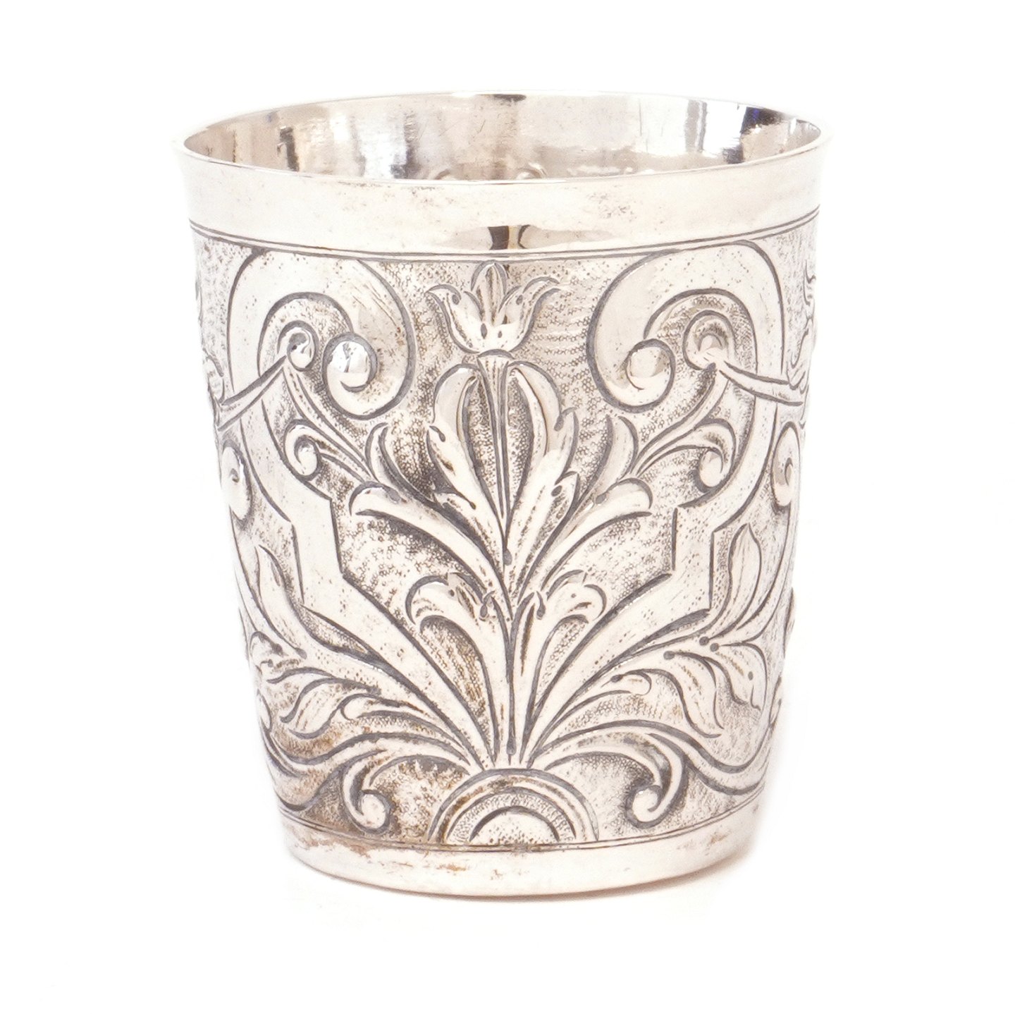 Drevet sølvbæger af Hans Christian Winther, København, 1786-1830 med portræt i relief. H: 7,5cm