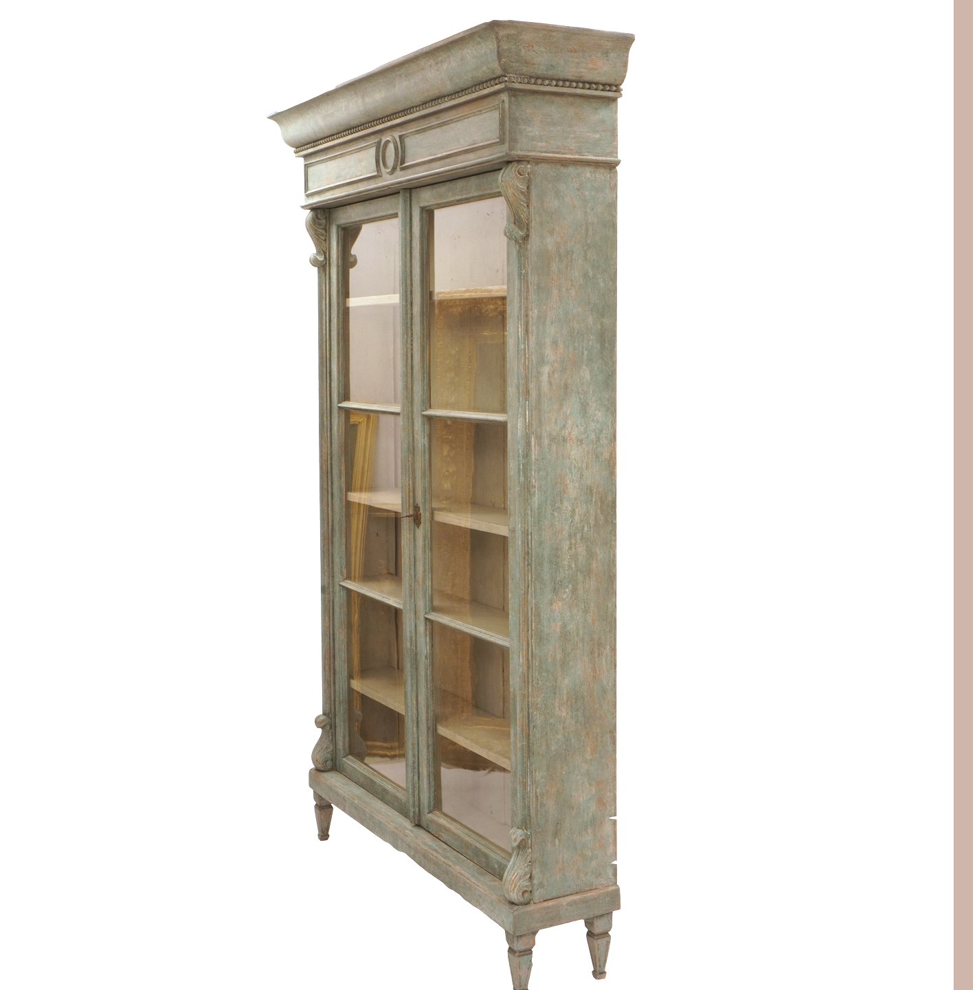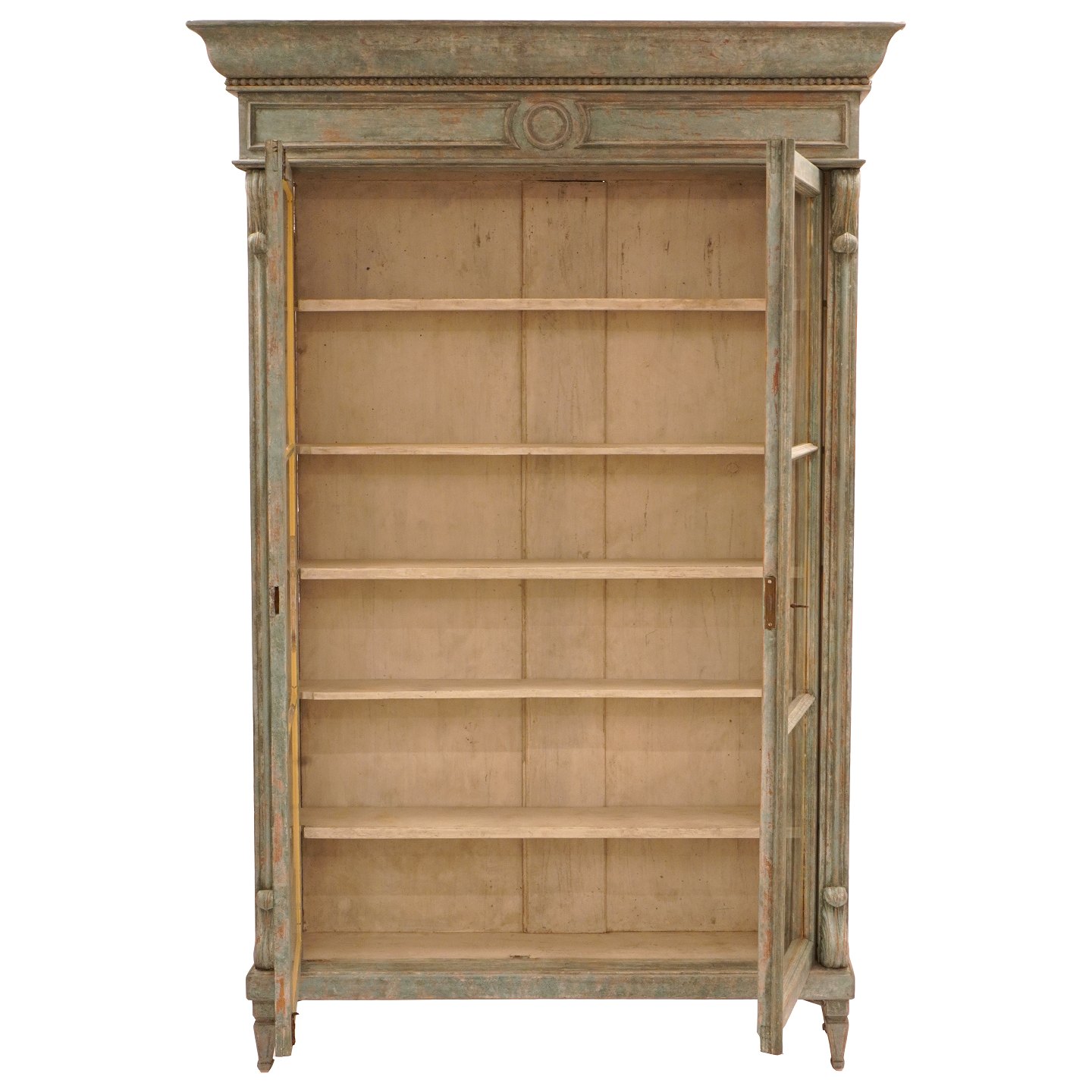 Lys grågrøn vitrine med to døre og fem hylder. Ca. år 1850. H: 213cm. B: 139cm. D: 36cm (top) / 25cm (midt)