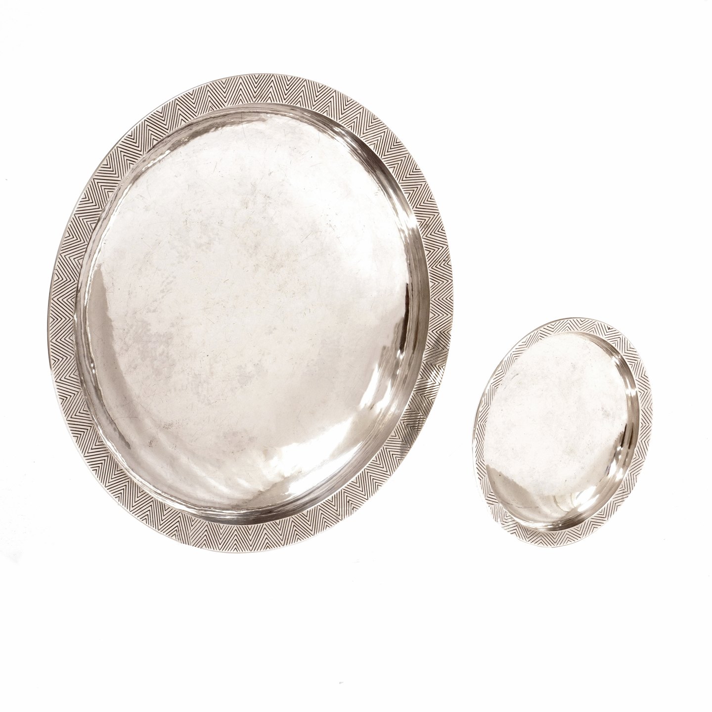 Sæt på to Hans Hansen sterlingsølv skåle med graverede faner. Stemplet Hans Hansen og dateret 1948. H hhv: 2,5 & 5cm. D hhv: 13 & 24cm. V: 872gr