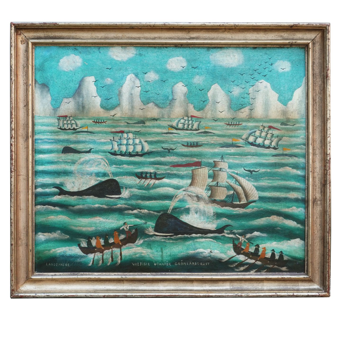 Parti med hvalfangere ud for Grønlands kyst, olie på lærred Signeret og dateret "Landenne 55" (år 1855). Betitlet "Valfiske Utanför Grönlands-Kust". Lysmål: 61x72cm. Med ramme: 72x83cm