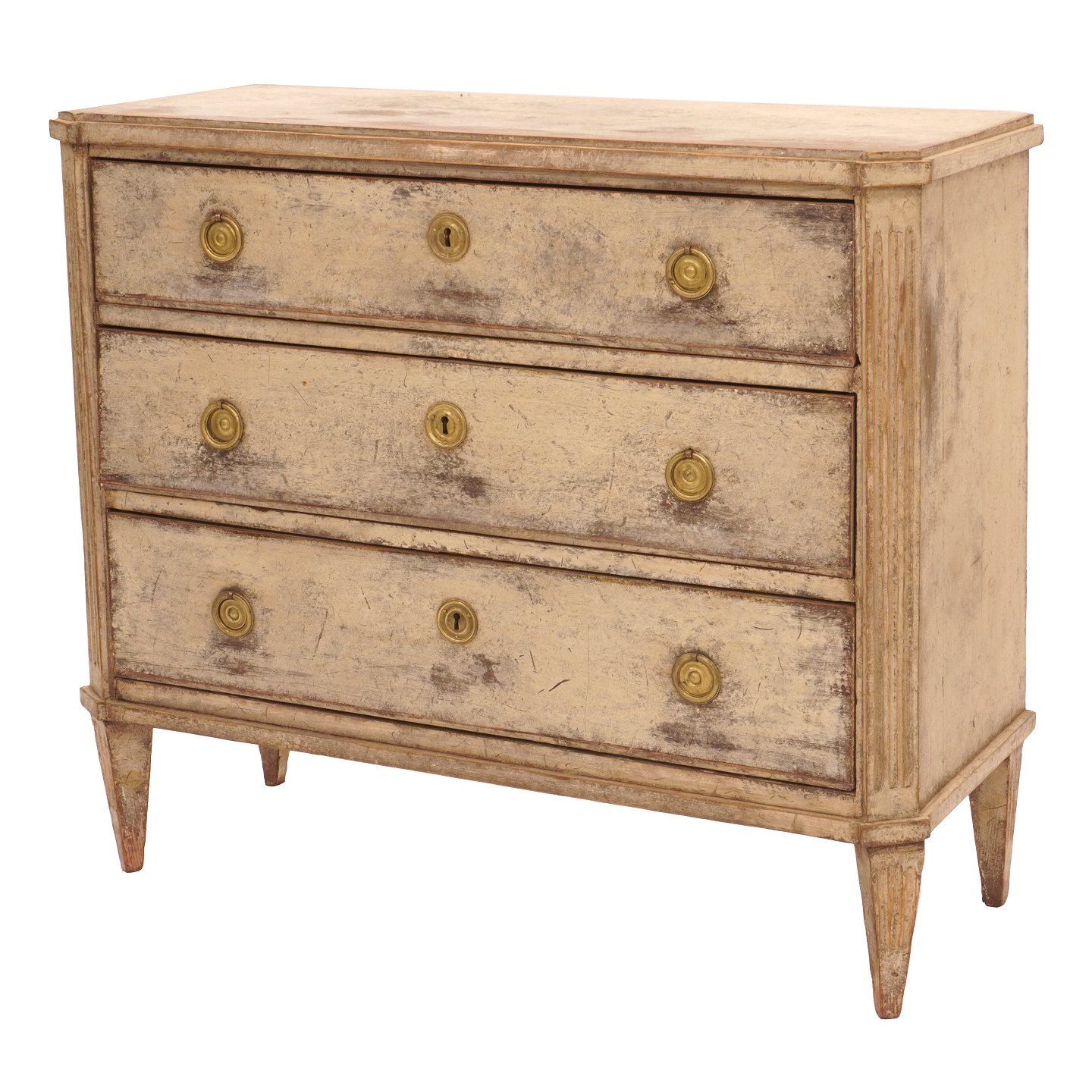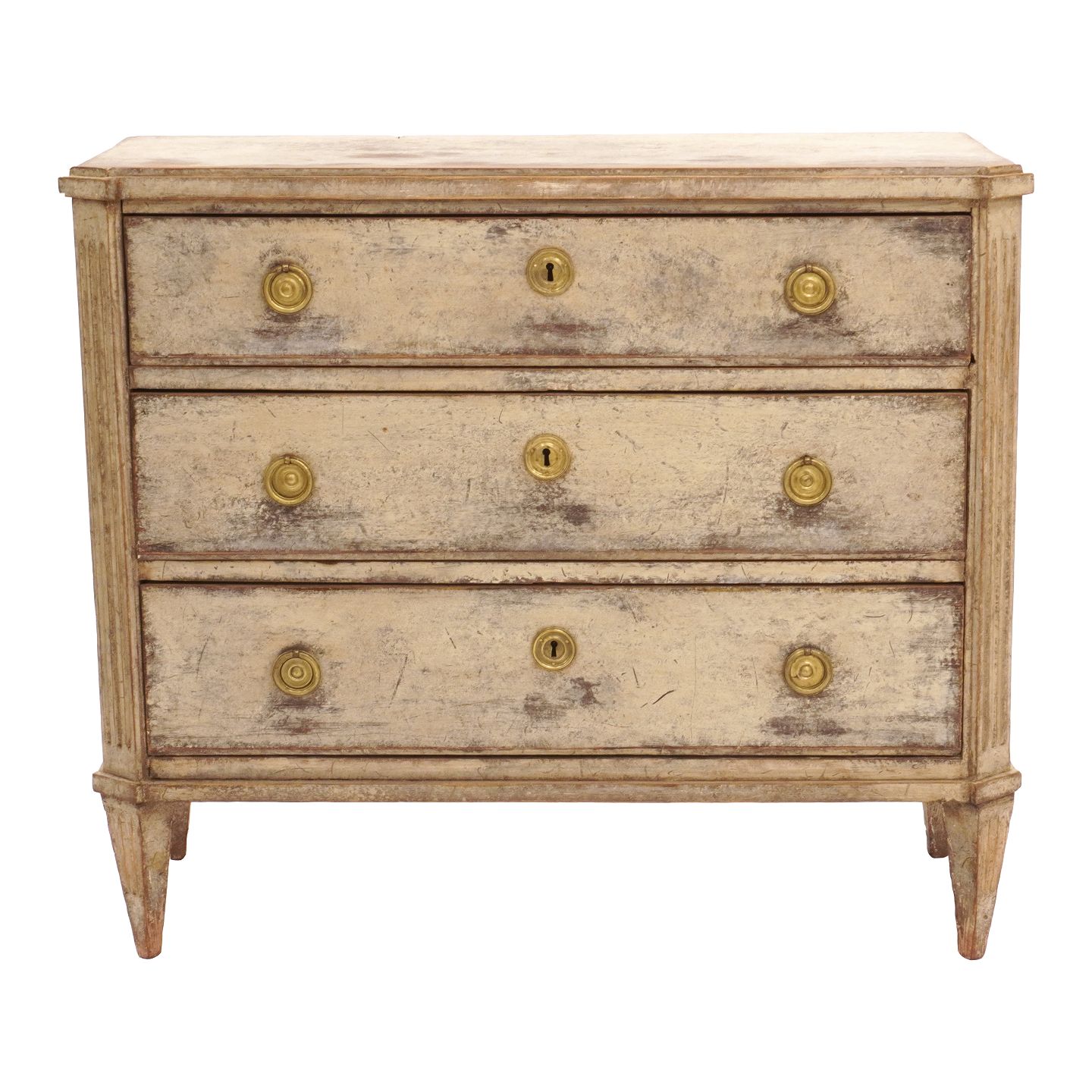 Gustaviansk kommode med tre skuffer kannelerede sidestykker og tilspidsede ben