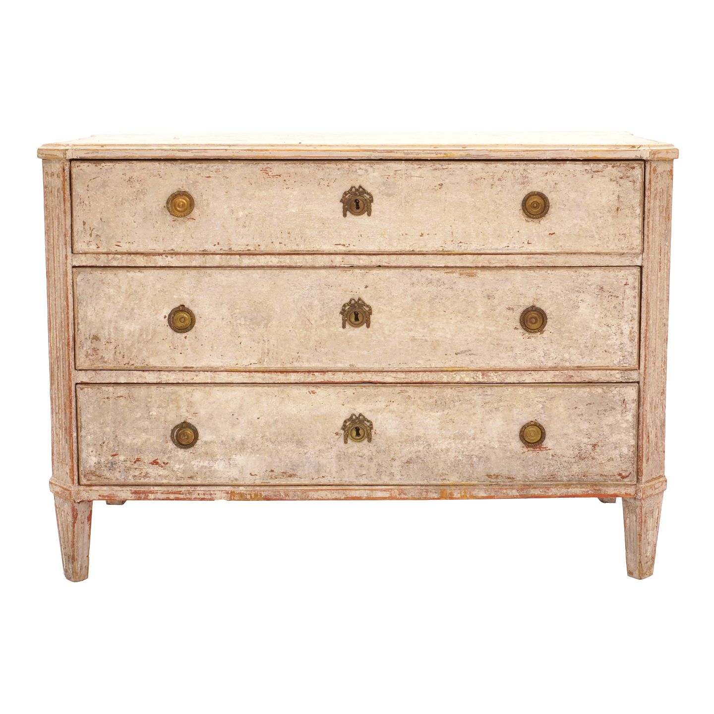 Gustaviansk kommode med tre skuffer kannelerede sidestykker og tilspidsede ben