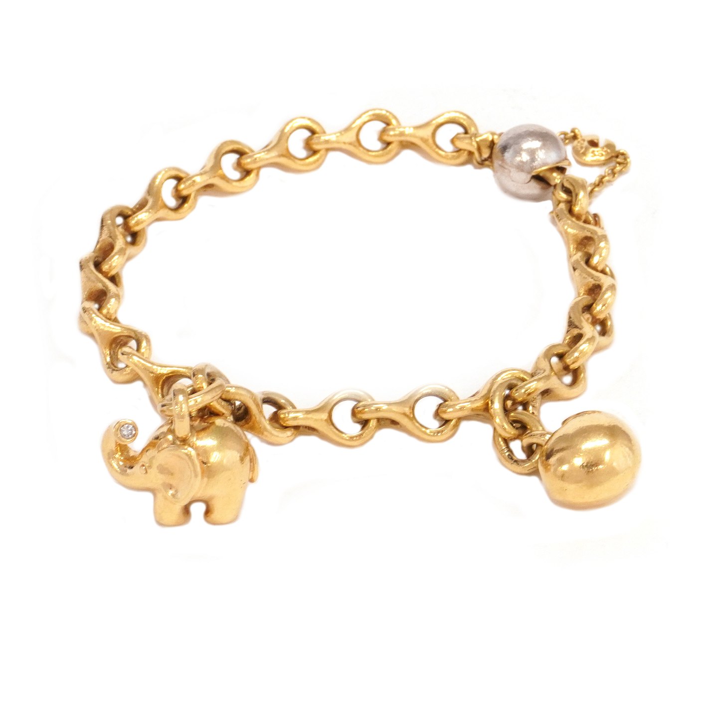 Ole Lynggaard 8-tals armlænke i 14kt guld med charms i form af elefant og hjerte. Kuglelås delvist hvidguld. Ledstr. 7x13mm