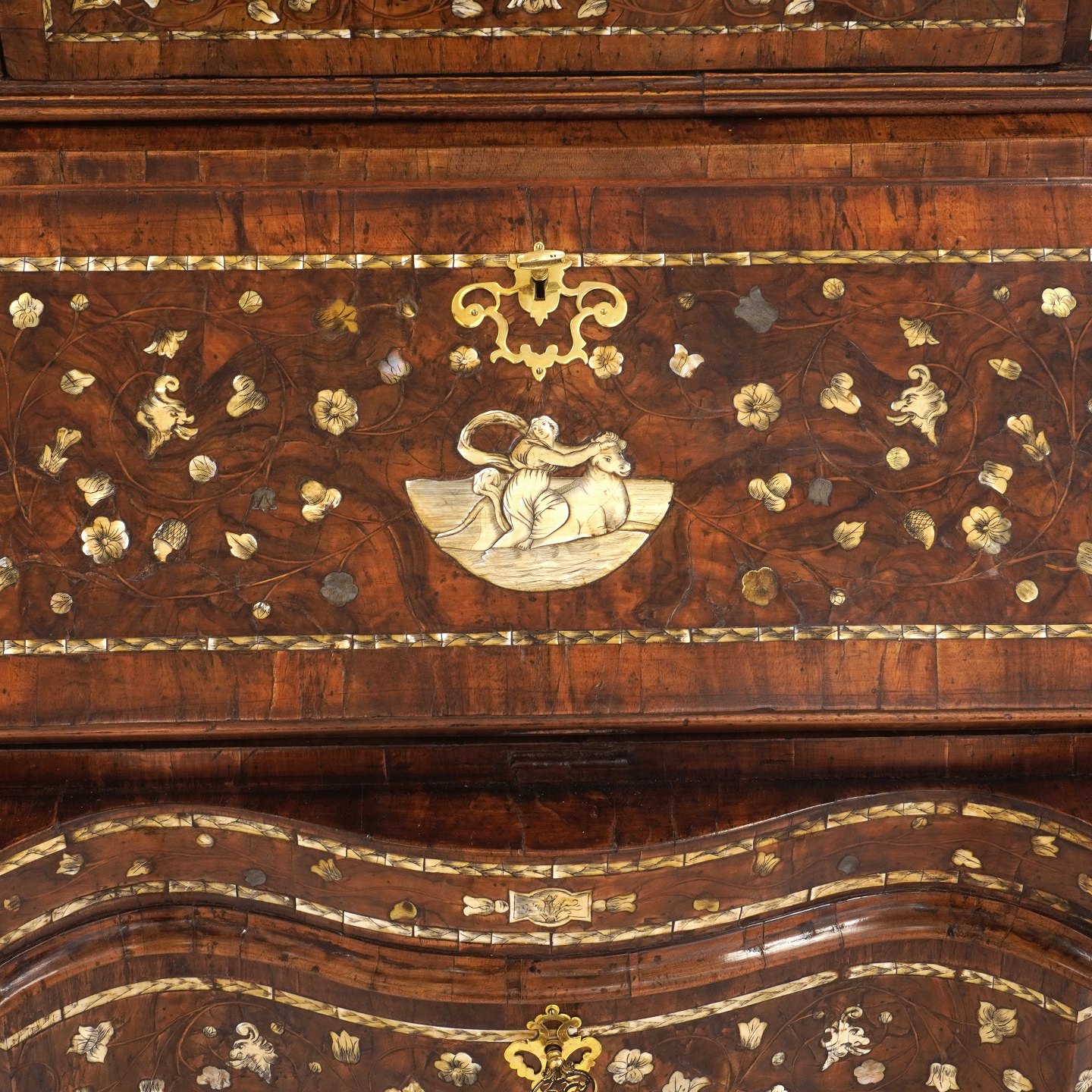 Venetiansk barokt pragtchatol i nøddetræ med talrige indlægningsarbejder. Overskab med spejl. Italien ca. år 1740. H: 235cm. B: 88cm. D: 78cm